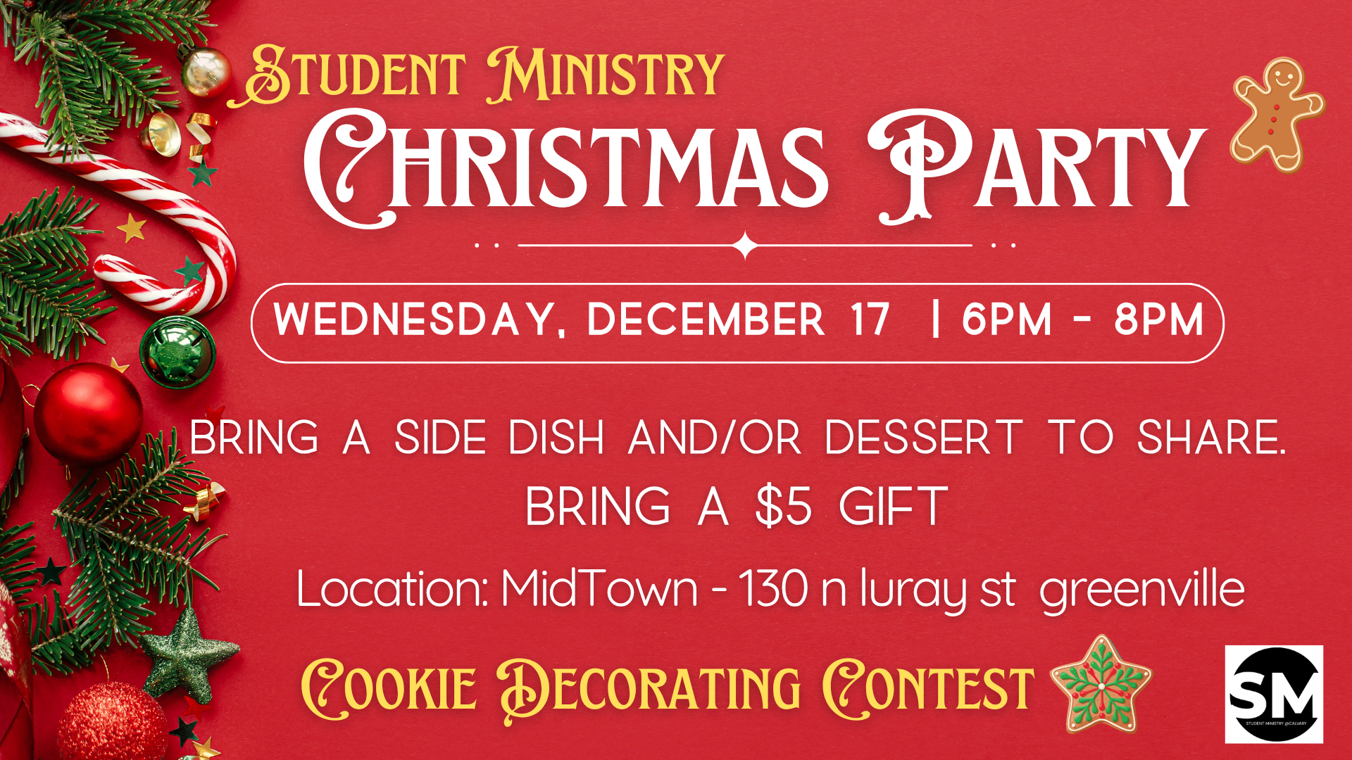 Student Ministry Christmas Party for 6-12 graders at MidTown on December 18th, 6:15-8 PM. Bring a gift valued around $5 for our gift exchange. The four groups will be middle school boys, middle school girls, high school boys, and high school girls.